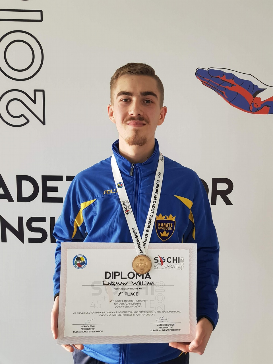 William Engman från Sundsvalls Sportkarate tog bronsmedalj på U21 EM i Ryssland . I stenhård konkurrens så krigade han till sig en bronsmedalj . I tredjepris matchen så slog han hemmahoppet i en kokande arena i Sortji. Mycket stor bedrift av både honom och de övriga i landslaget som tog många fina placeringar samt två bronsmedaljer.Nästa uppgift är redan i nästa helg då serie A tävlingarna i Spanien avgörs.